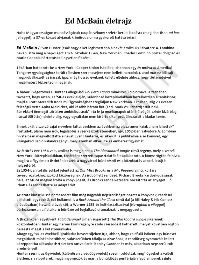 While successful and well known as Evan Hunter, he was even better known as Ed McBain, a name he used for most of his crime fiction, beginning in 1956.